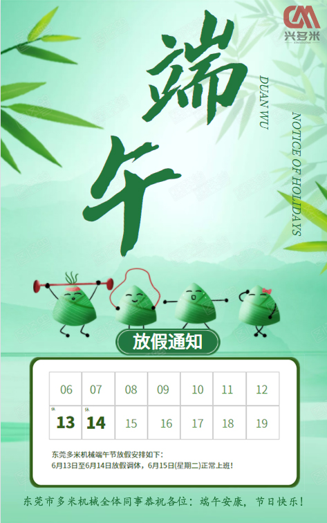 一年一端午,一歲一安康,又到了一年粽子飄香的端午節(jié),多米機械提前祝大家端午安康,節(jié)日快樂!多米機械公司放假時間為:2021年6月13日(本周日)至2020年6月14日(端午節(jié))共放假兩天,6月15日恢復(fù)正常上班。